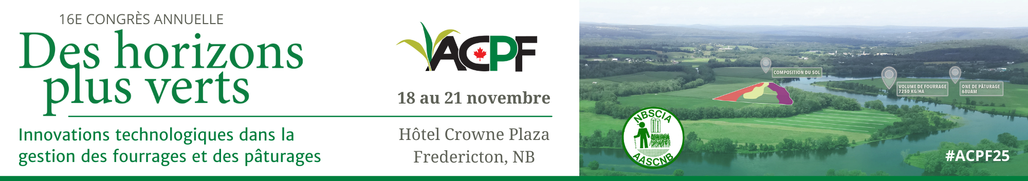 Le congrès annuel 2025 de l’Association canadienne pour les plantes fourragères (ACPF) se tiendra dans les Maritimes. L’ACPF collabore avec l’Association pour l’amélioration du sol et des cultures du Nouveau-Brunswick (NBSCIA) afin d’organiser son 16e congrès annuel au célèbre hôtel Crowne Plaza de Fredericton, au Nouveau-Brunswick, du 18 au 21 novembre.